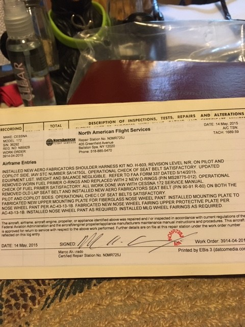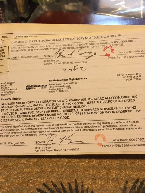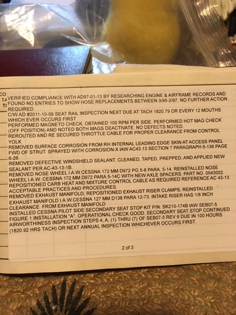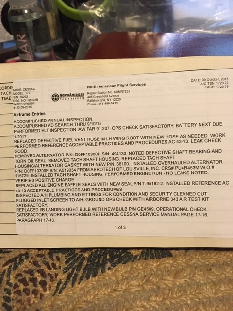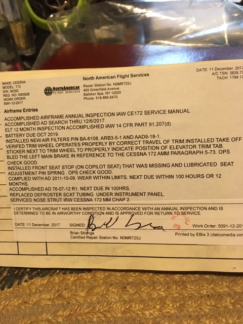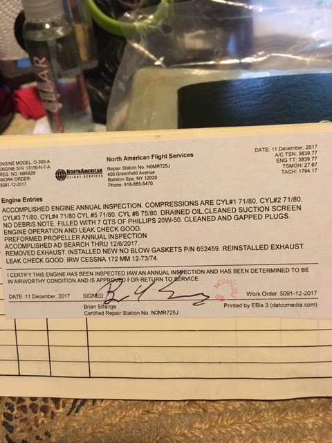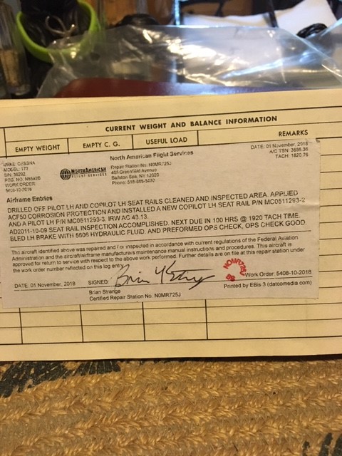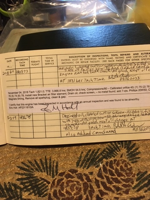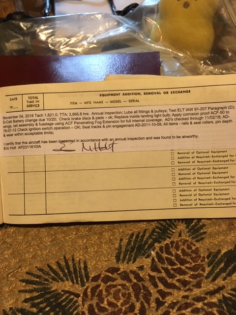 | Maintenance: | Annual completed 11/4/2018 Always stored in hangar All repairs documented in logs |