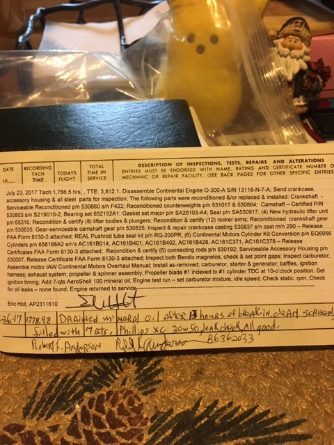 | Engine Detail | Continental Engine O-300-A S/N 13116-N-7-A MO 7/23/17 |